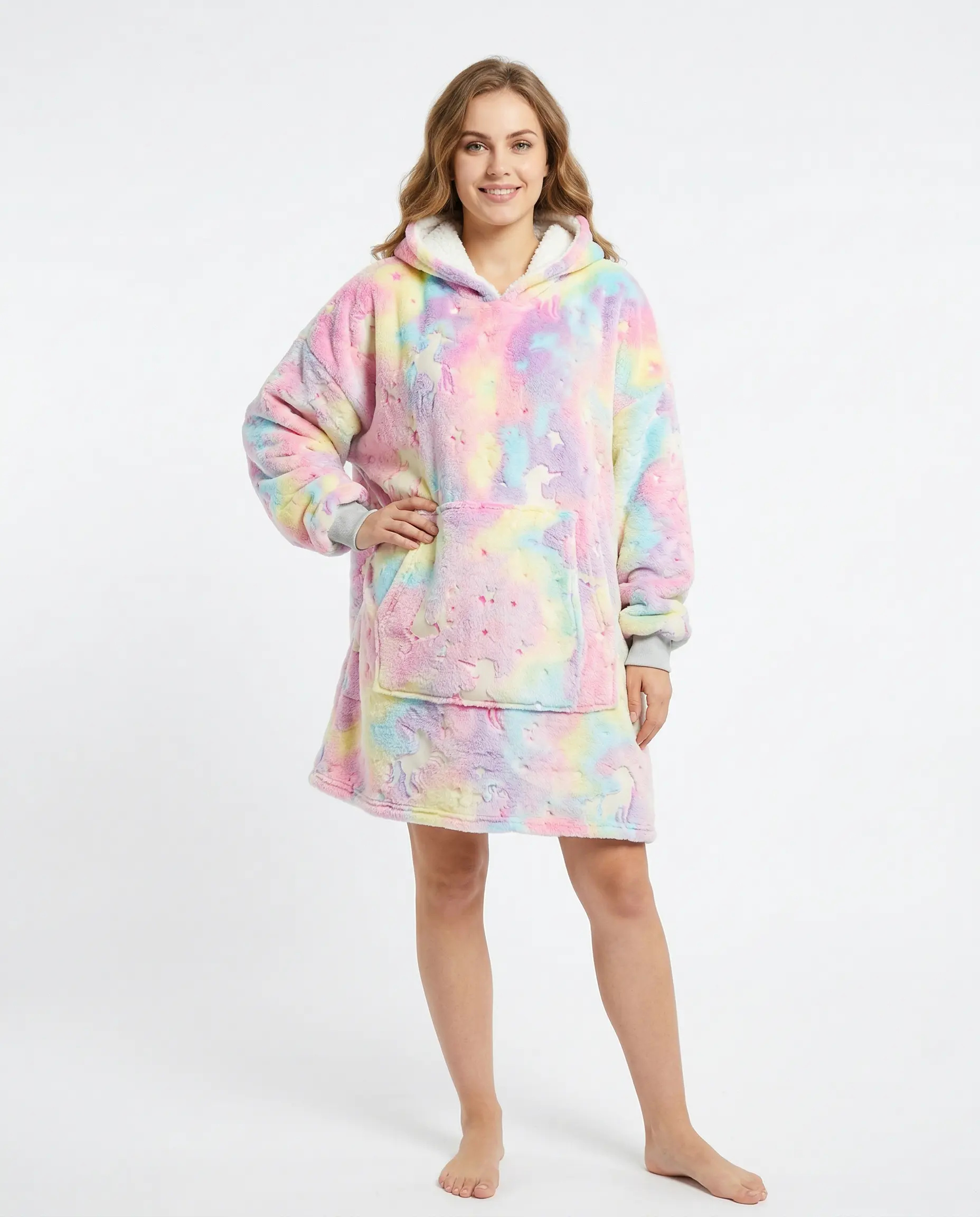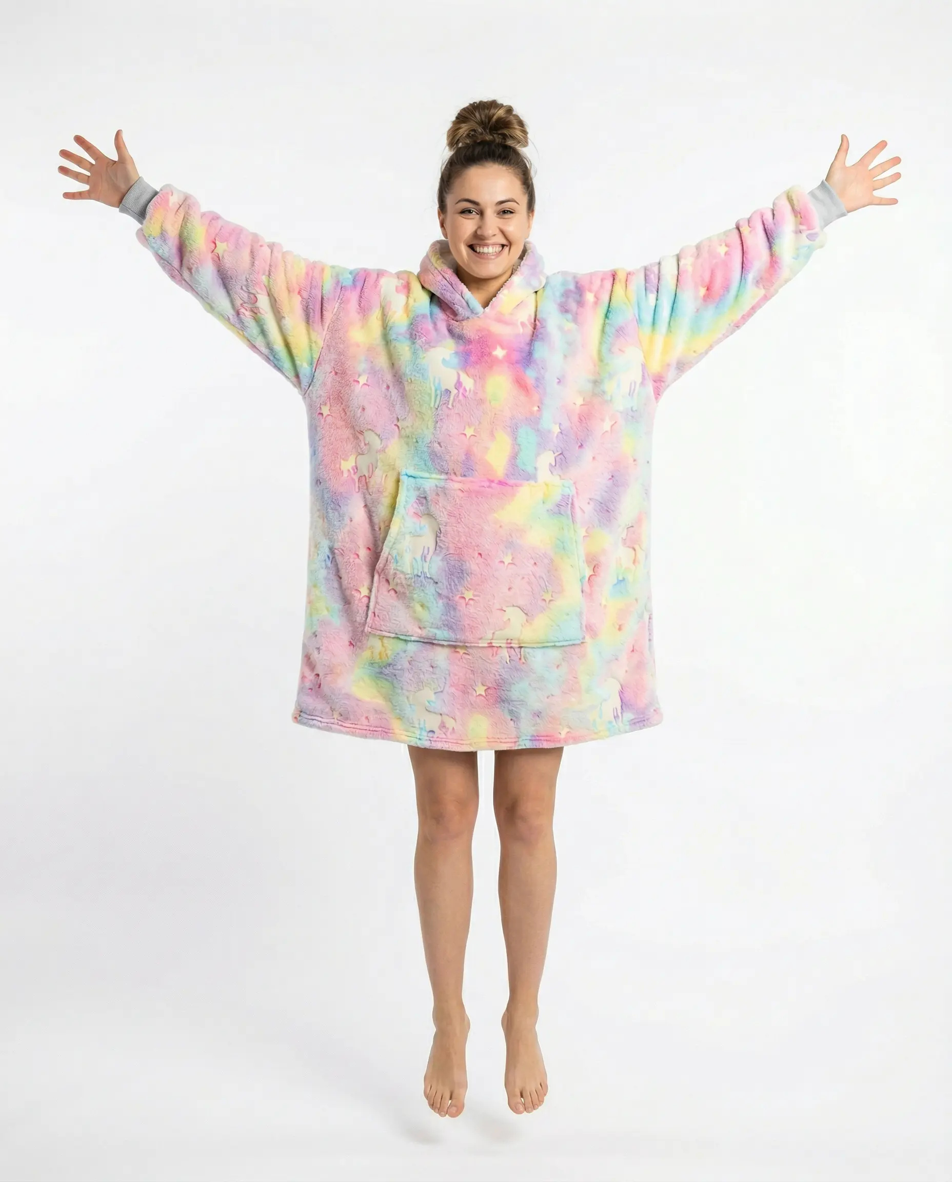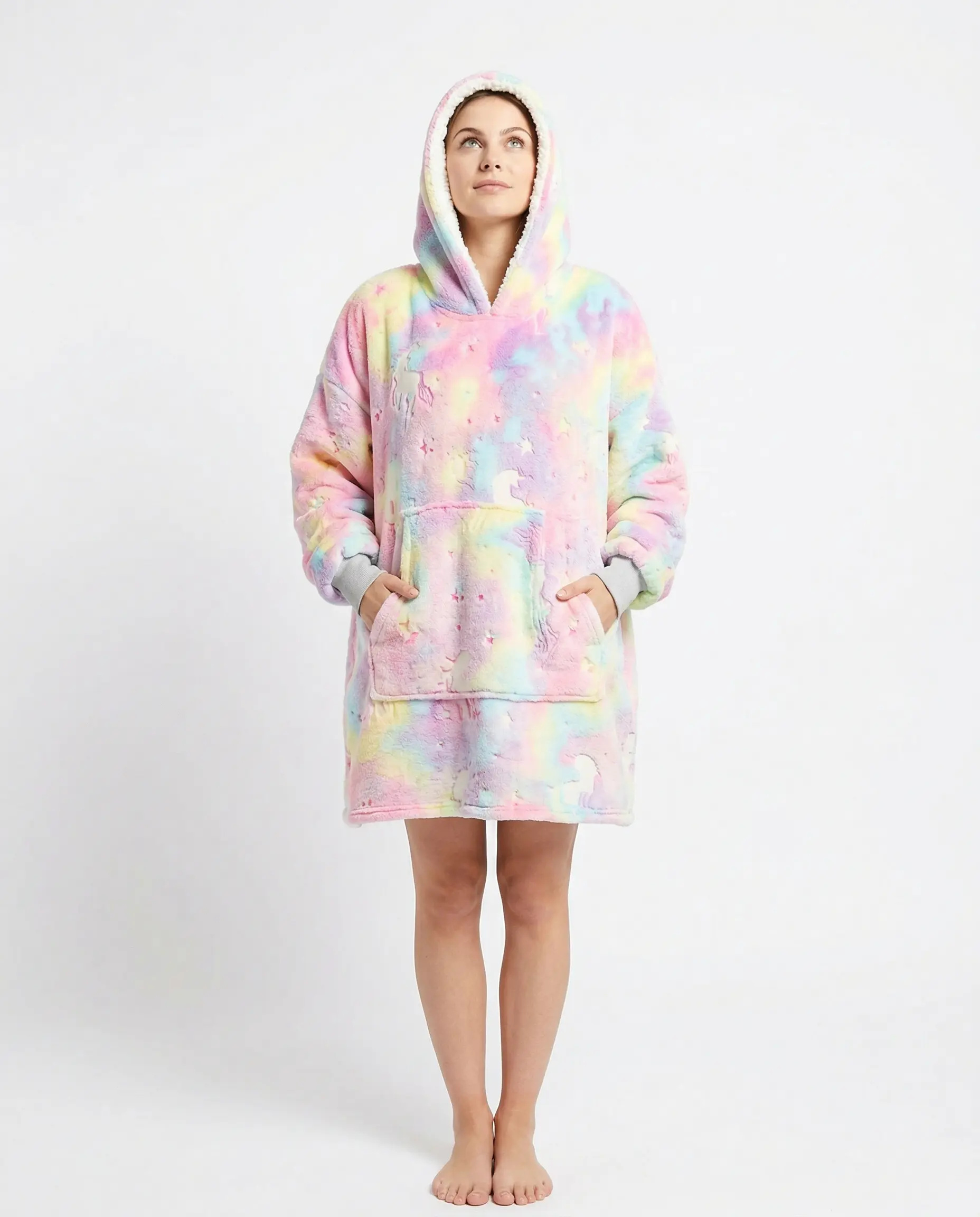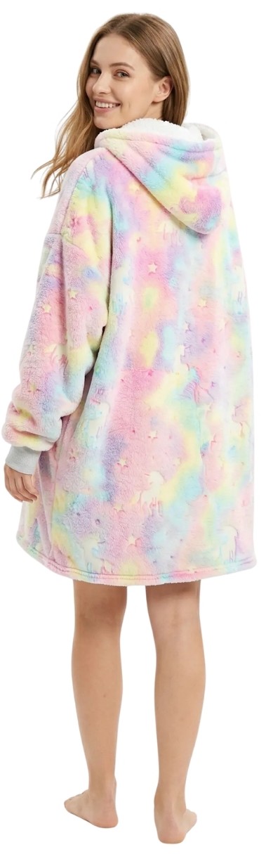 Wykonana z miękkiego materiału, kocobluza przyjemnie otula ciało i zapewnia doskonałą izolację ciepła. Oversize’owy krój gwarantuje swobodę ruchów oraz uniwersalne dopasowanie – niezależnie od sylwetki. To idealny wybór zarówno do relaksu na kanapie, pracy zdalnej, jak i chłodnych poranków.