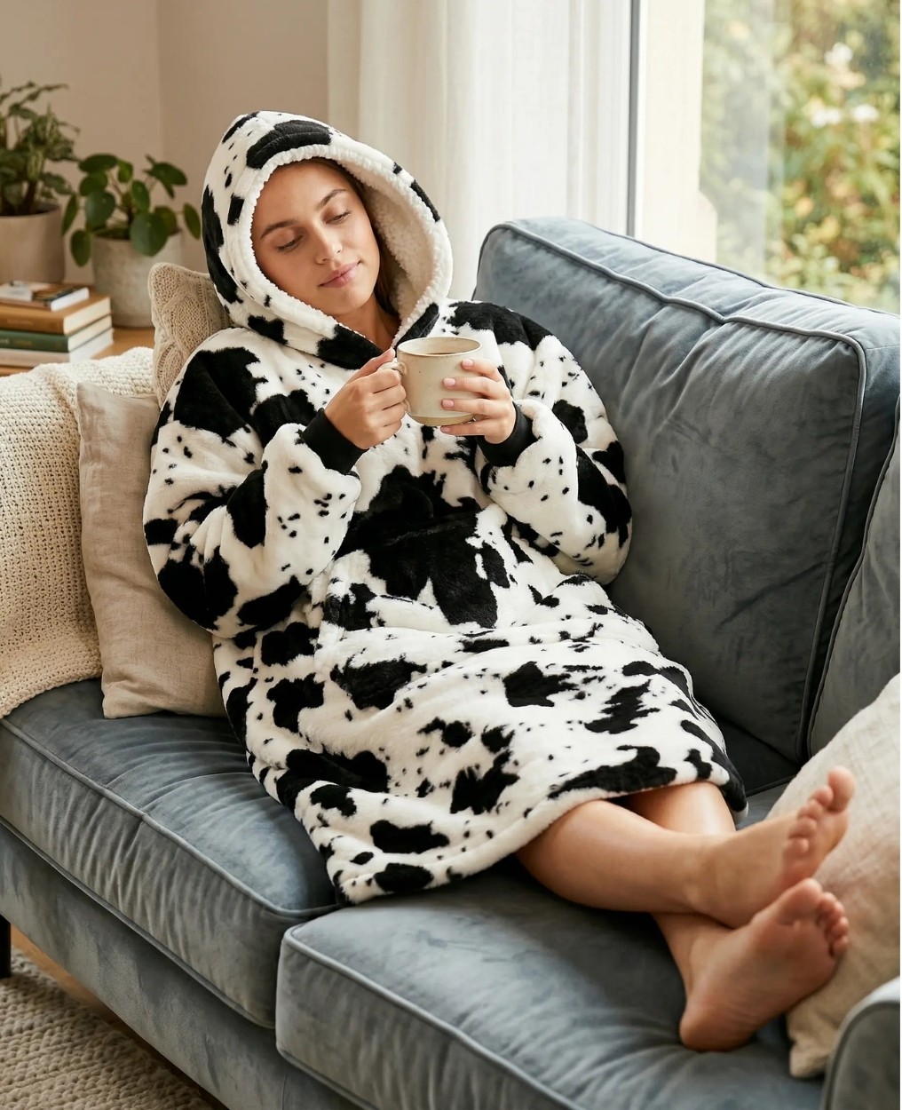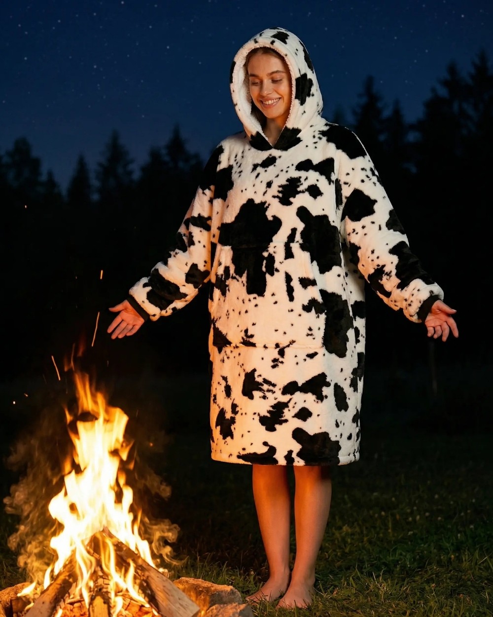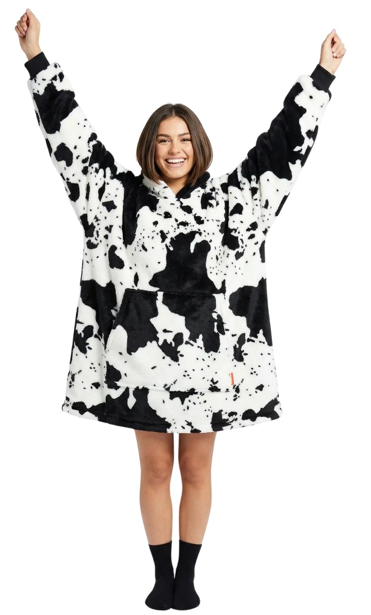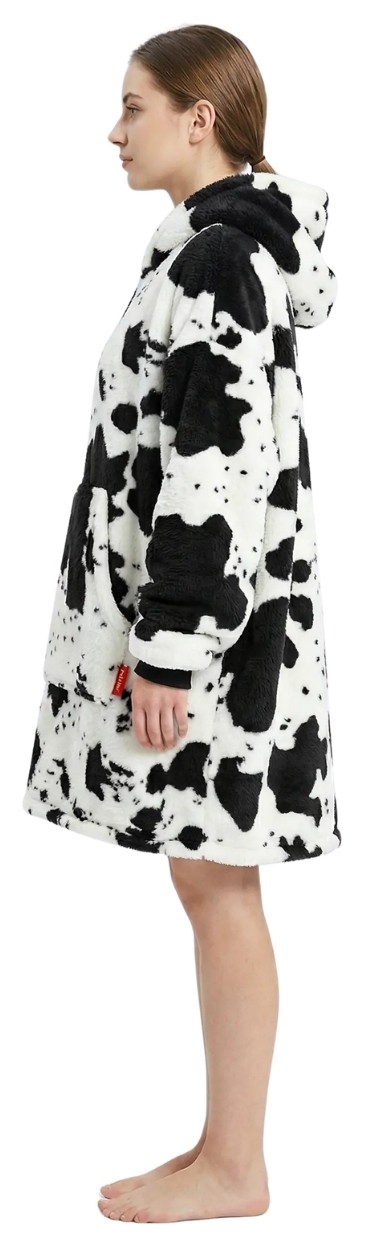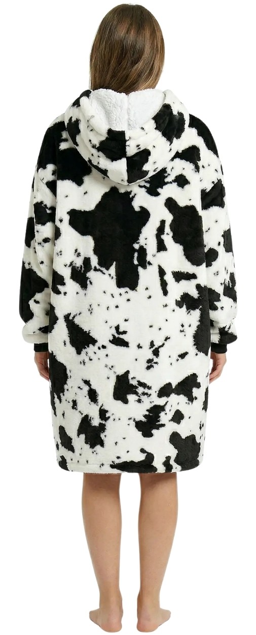 Charakterystyczny wzór w krowie łaty przyciąga uwagę i nadaje całości unikalnego charakteru – to świetna opcja dla osób, które chcą połączyć wygodę ze stylem. Duży kaptur dodatkowo chroni przed chłodem, a praktyczna kieszeń typu kangur pozwala ogrzać dłonie lub przechowywać drobne przedmioty, takie jak telefon czy pilot. Ściągacze przy rękawach pomagają utrzymać ciepło i zwiększają wygodę użytkowania, co sprawia, że kocobluza doskonale sprawdzi się w sezonie jesienno-zimowym, ale także podczas chłodniejszych dni przez cały rok.