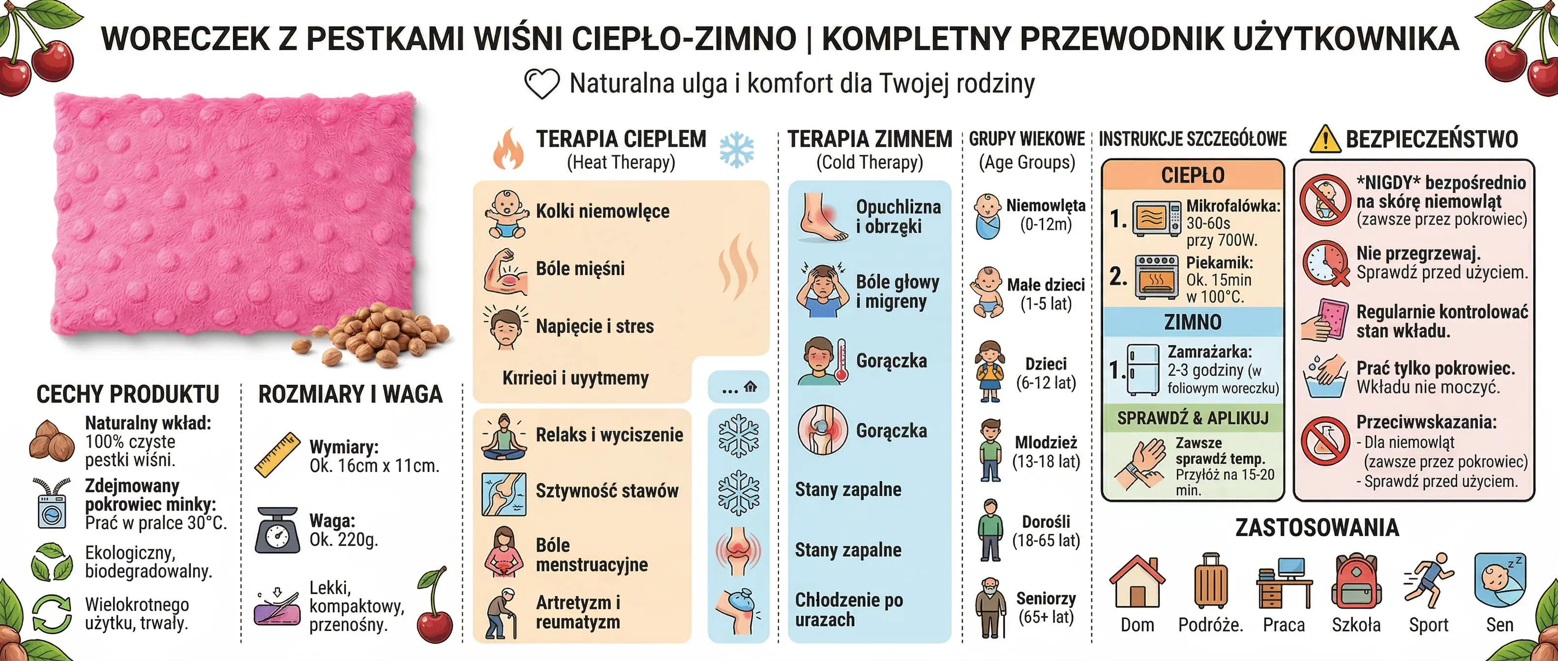 Termofor z pestek wiśni to produkt wielorazowy, trwały i przyjazny dla środowiska. Nie zawiera cieczy, dzięki czemu jest bezpieczny również dla dzieci. Może być stosowany zarówno przez dorosłych, jak i najmłodszych, co czyni go praktycznym elementem każdej domowej wyprawki.