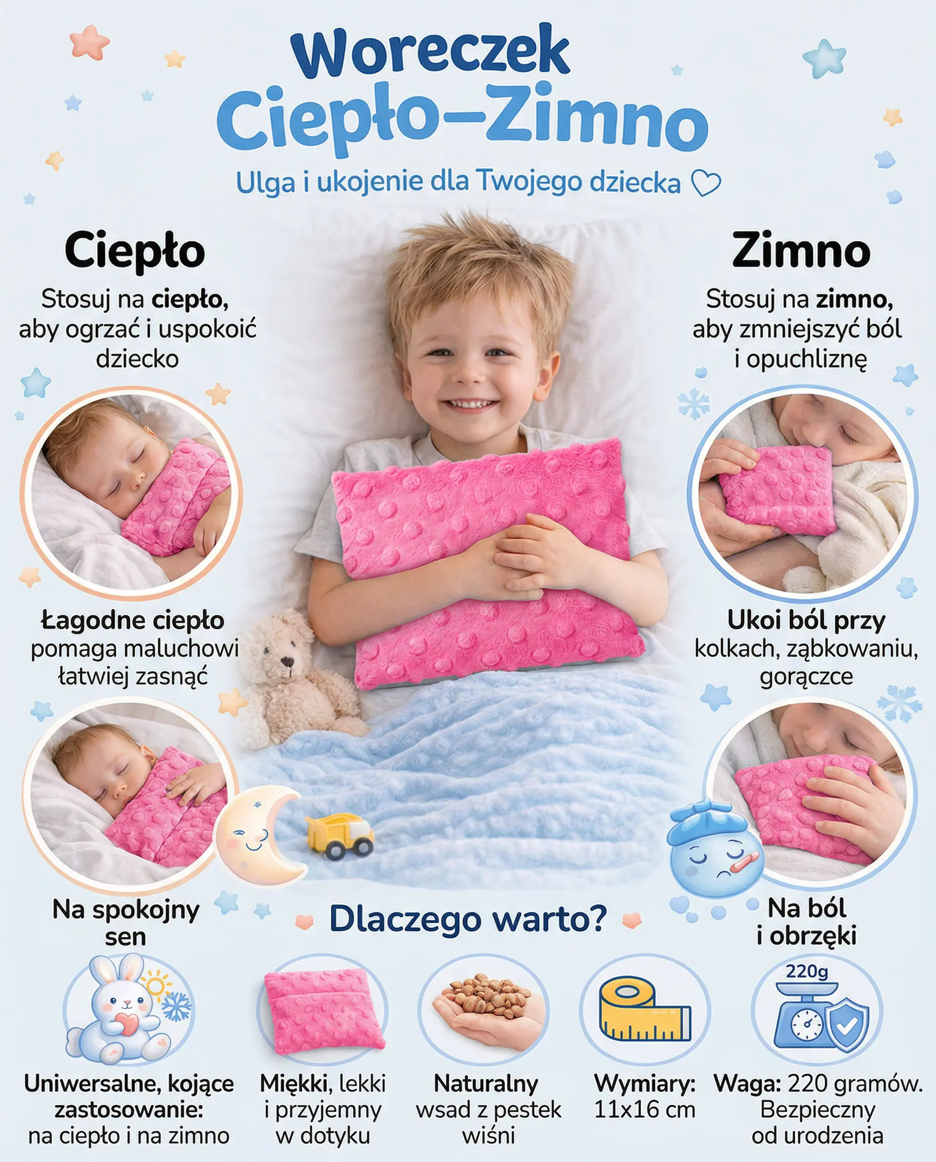 Praktyczny, naturalny i bezpieczny termofor z pestek wiśni to idealne rozwiązanie dla niemowląt, dzieci i dorosłych. Został zaprojektowany z uwzględnieniem sugestii położnych, dzięki czemu ma optymalny rozmiar i wagę – nie obciąża delikatnego brzuszka dziecka, a jednocześnie skutecznie utrzymuje temperaturę.